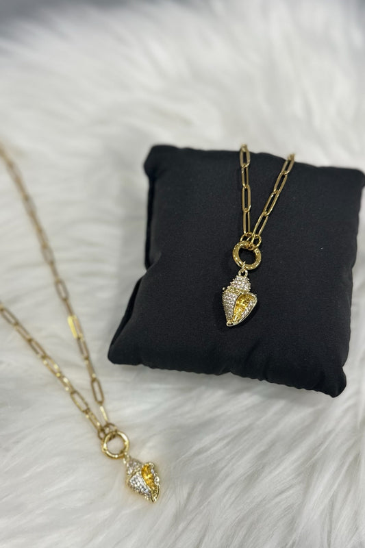 KW CZ CONCH SHELL PAPERCLIP CHARM KEEPER NECKLACE 18K PVD *WATERPROOF*
