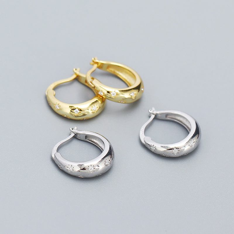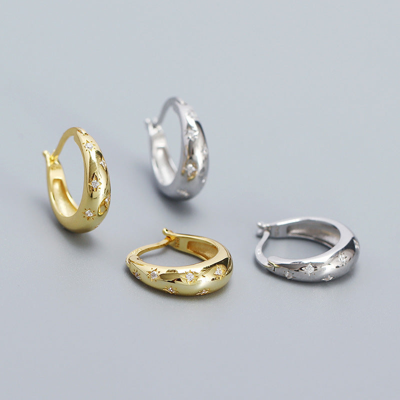 Hot Shining CZ Eight Pointed Stars 925 Sterling Silver Hoop Earrings